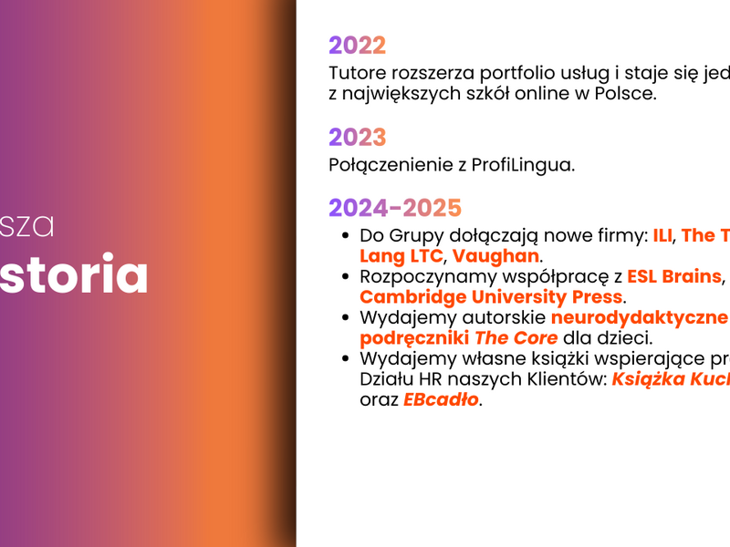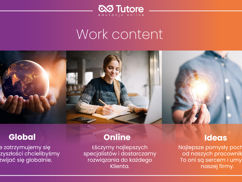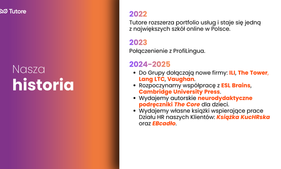 Tutore Start to kompleksowy program praktyk oferowany przez największą w Europie grupę edukacyjną specjalizującą się w nauczaniu języków obcych, przedmiotów szkolnych oraz kursów hobbystycznych w formie online i stacjonarnej. Nasza grupa składa się z 7 wyspecjalizowanych spółek, dzięki czemu praktykanci mogą rozwijać się w różnych segmentach edukacji i wybrać ścieżkę najlepiej dopasowaną do swoich zainteresowań oraz wymagań uczelni.